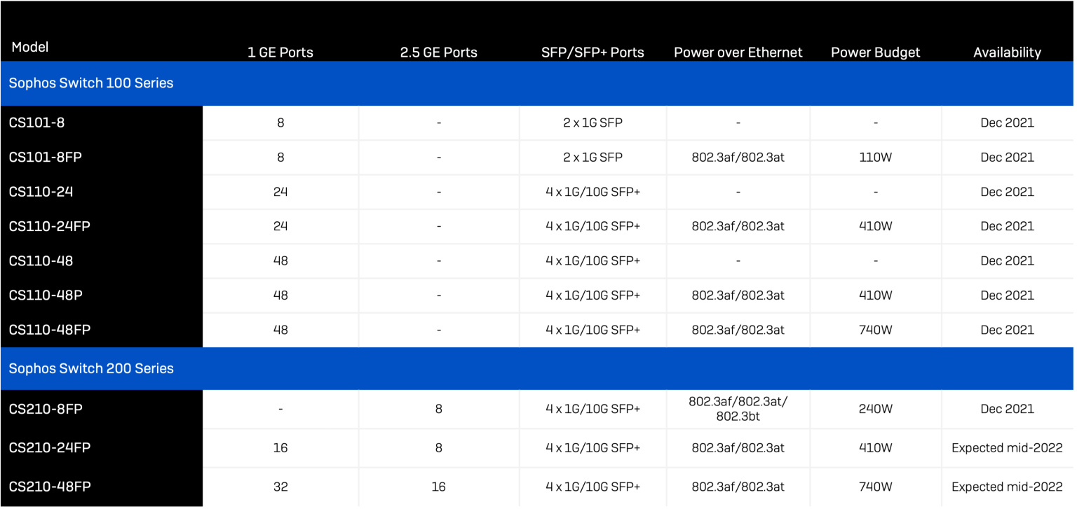 Sophos wird zunächst acht Modelle anbieten, zwei weitere werden für Mitte 2022 erwartet. Alle Switches können in Sophos Central zusammen mit Ihren anderen Sophos Produkten verwaltet werden. Der volle Funktionsumfang und die Konfiguration sind jedoch ab der ersten Version nur über die lokale Web-Benutzeroberfläche verfügbar. Die Verwaltung wird auch über das Command Line Interface (CLI) oder das Simple Networking Management Protocol (SNMP) unterstützt.